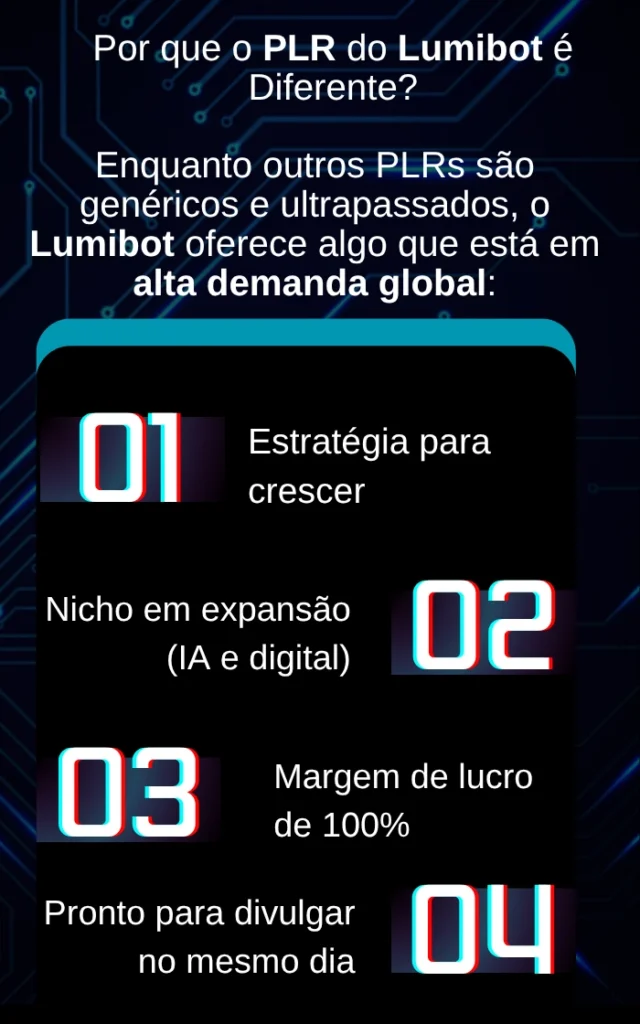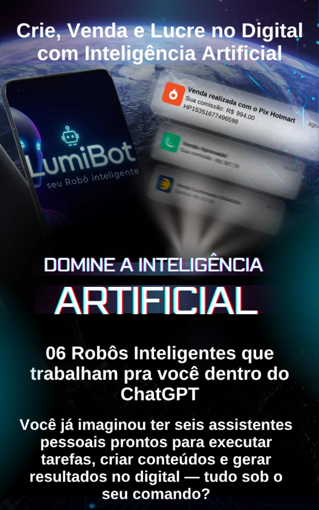 O Lumibot foi criado para ser seu atalho no mundo digital, colocando 06 robôs inteligentes sob seu comando para criar, vender, analisar e lucrar — mesmo que você esteja começando do zero.